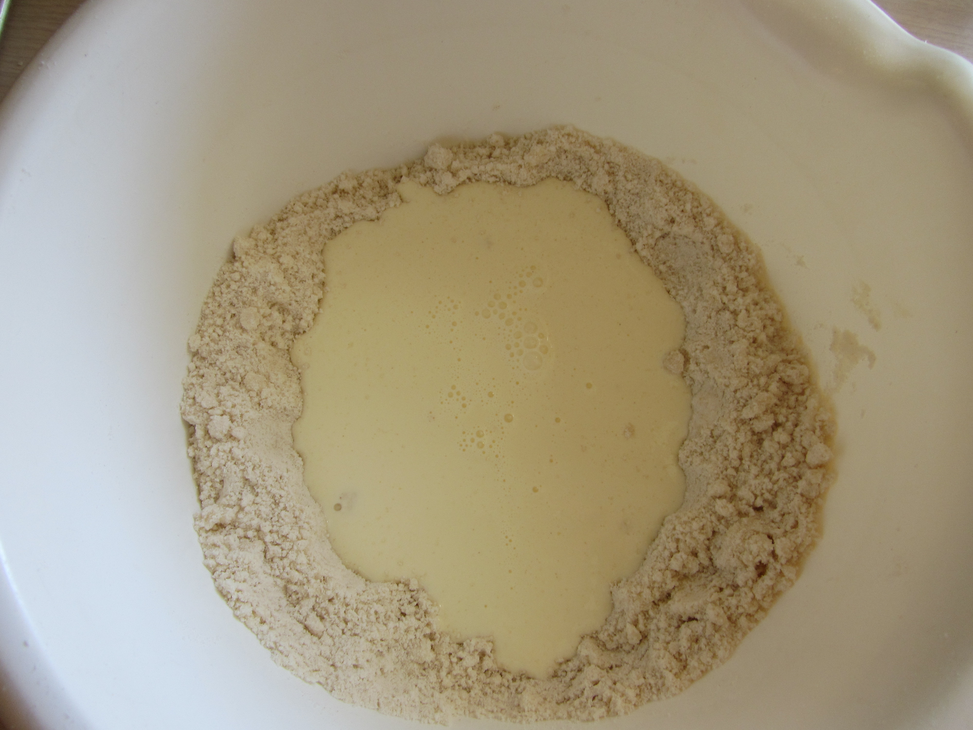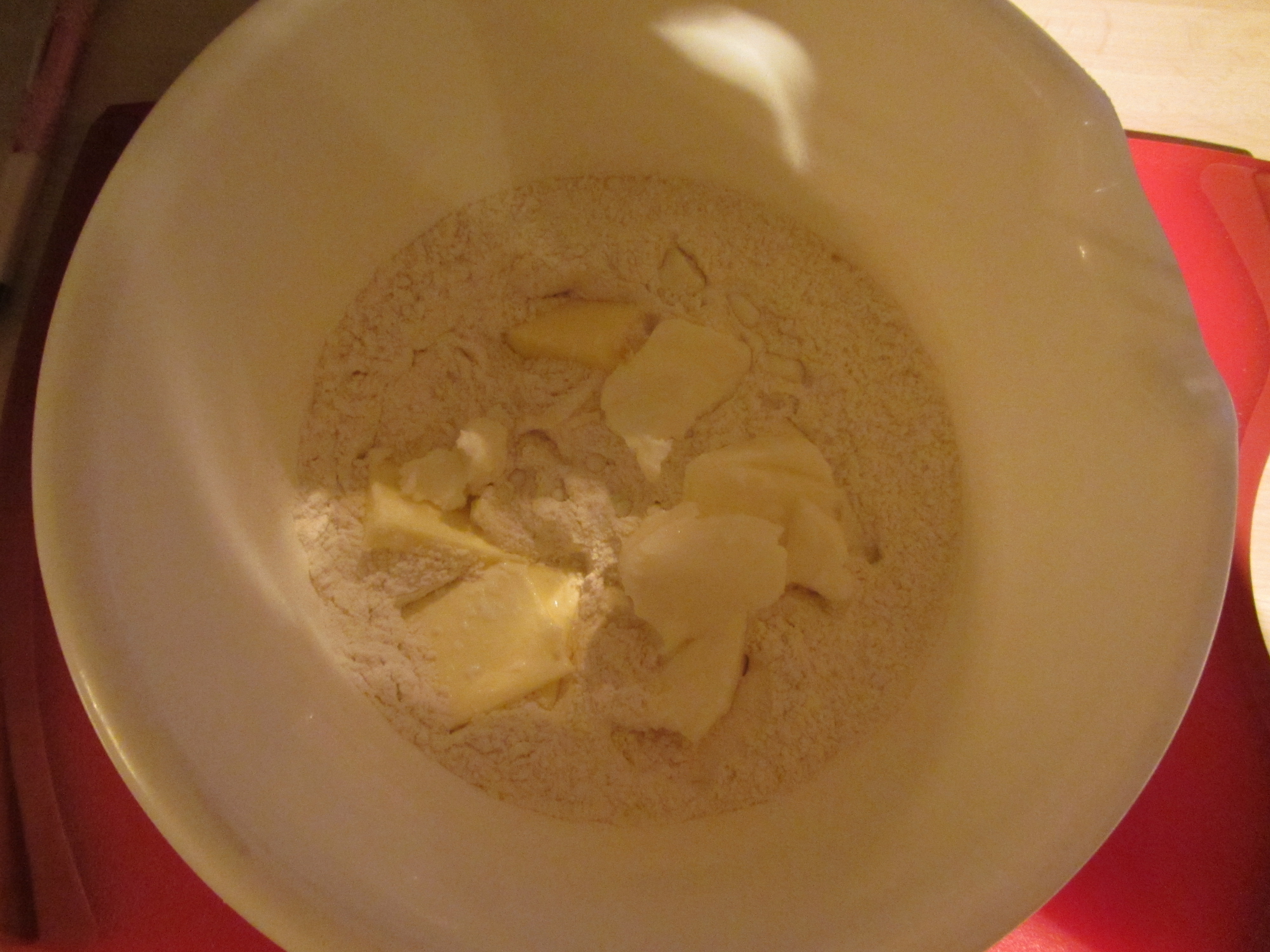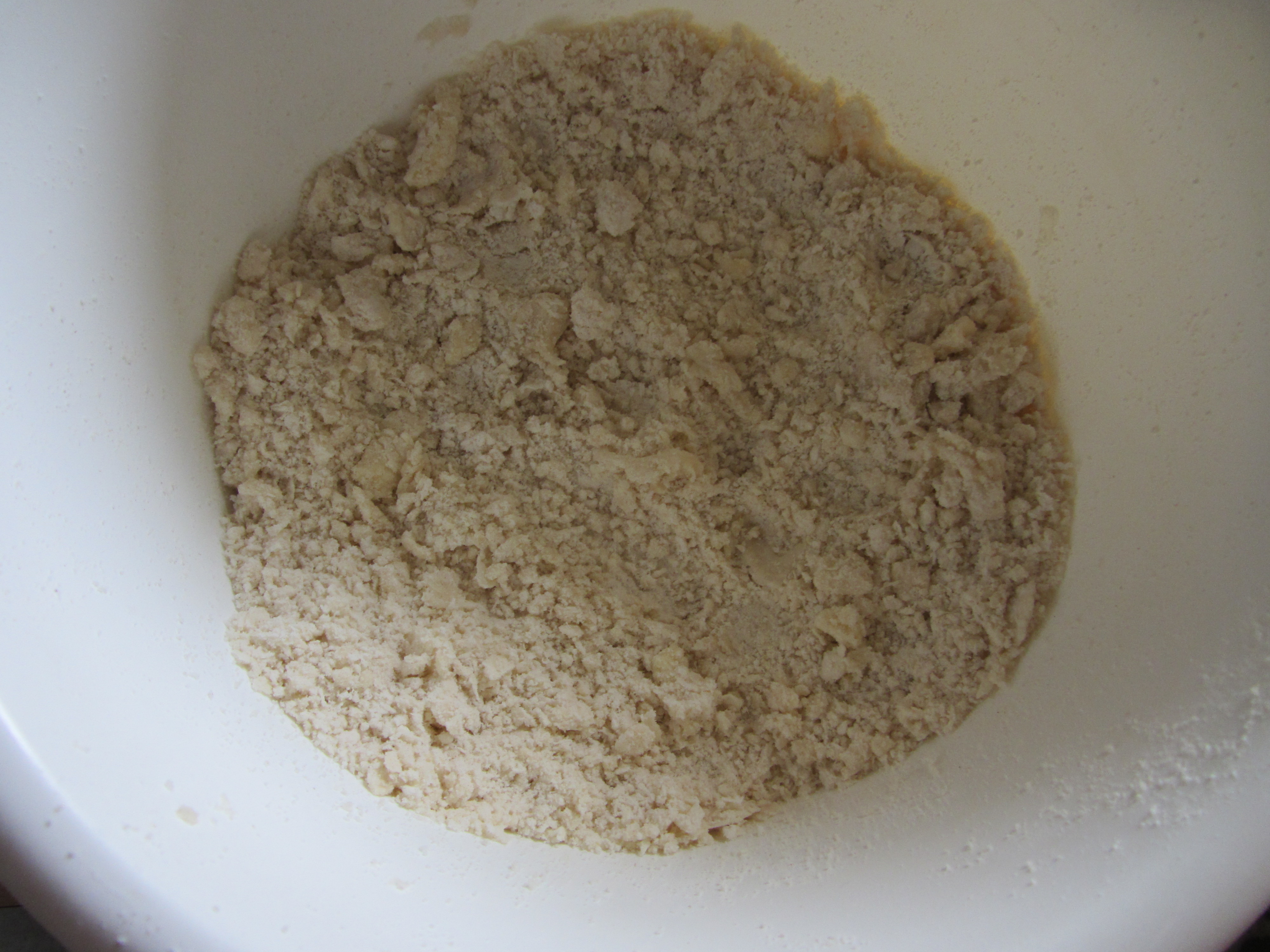 I combined my dry ingredients, and then cut in the fat with my fingers until I had a crumb-like texture.