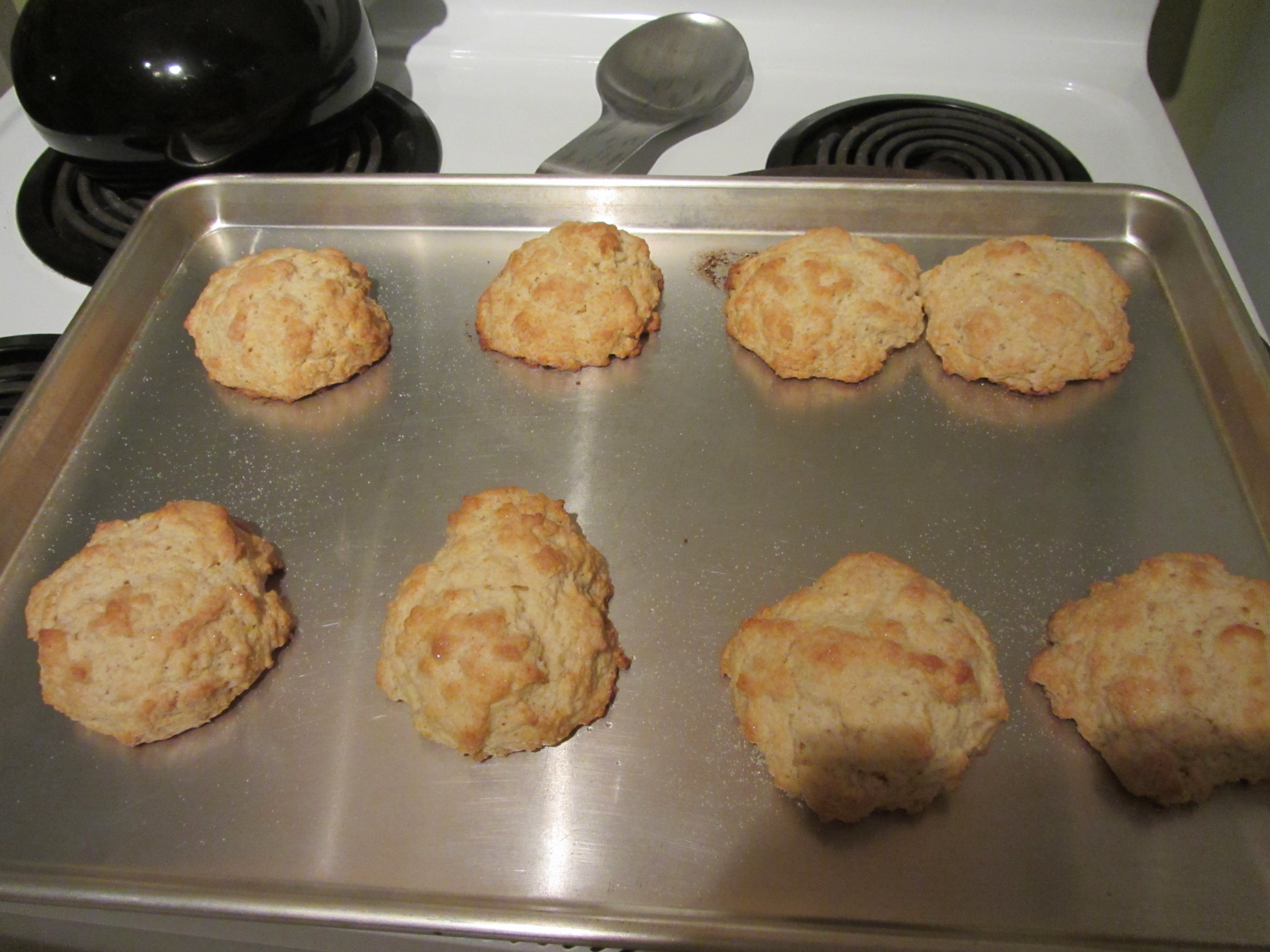 We ate our biscuits warm from the oven, split, and buttered. My dad has made biscuits for years, and his are quite different from these biscuits. I grew up with super light, flaky biscuits, while these biscuits were more cake-like and dense. I thought they were very good, and they are such a quick breakfast treat. Having listened to some of Alton’s podcasts, I have gathered that he now uses a round pan when he makes biscuits, and that he covers them when they come out of the oven. Perhaps I’ll have to try a round pan next time, along with self-rising flour.