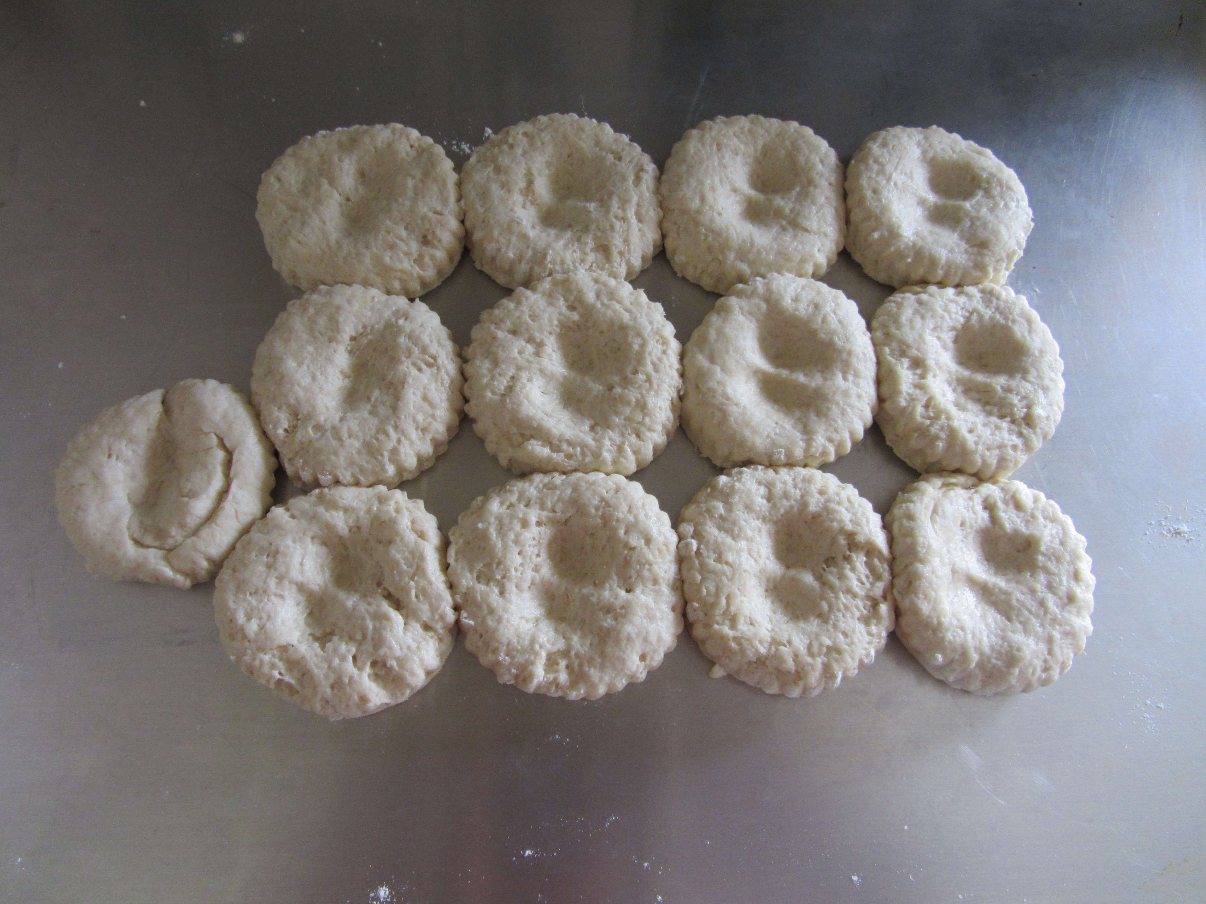 Surprisingly, it was actually very easy to work with. I cut out my biscuits with a 2.5-inch cutter, and placed them on my baking sheet so they were just barely touching. I indented the top of each biscuit with my fingers (this was another thing mentioned in the episode that is not in the online recipe) to prevent having domed tops, and baked them until they were golden brown.
