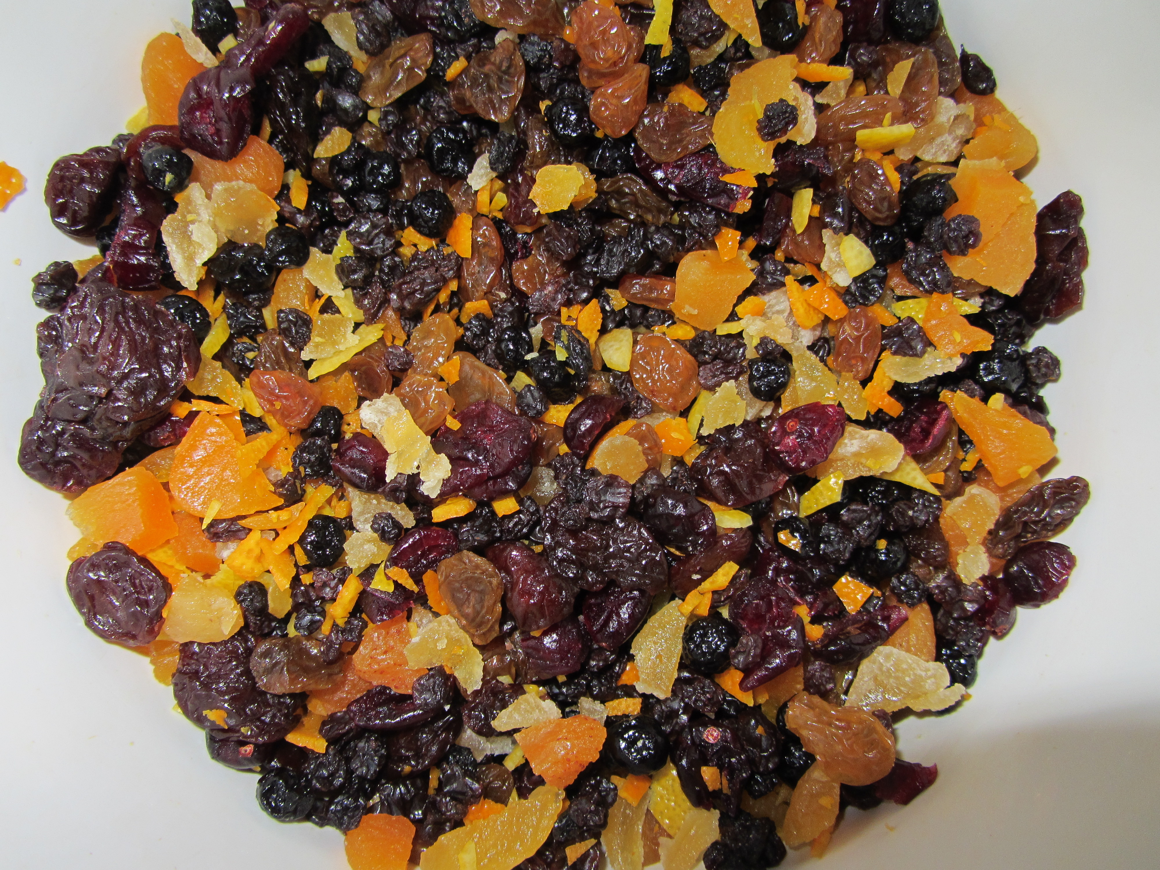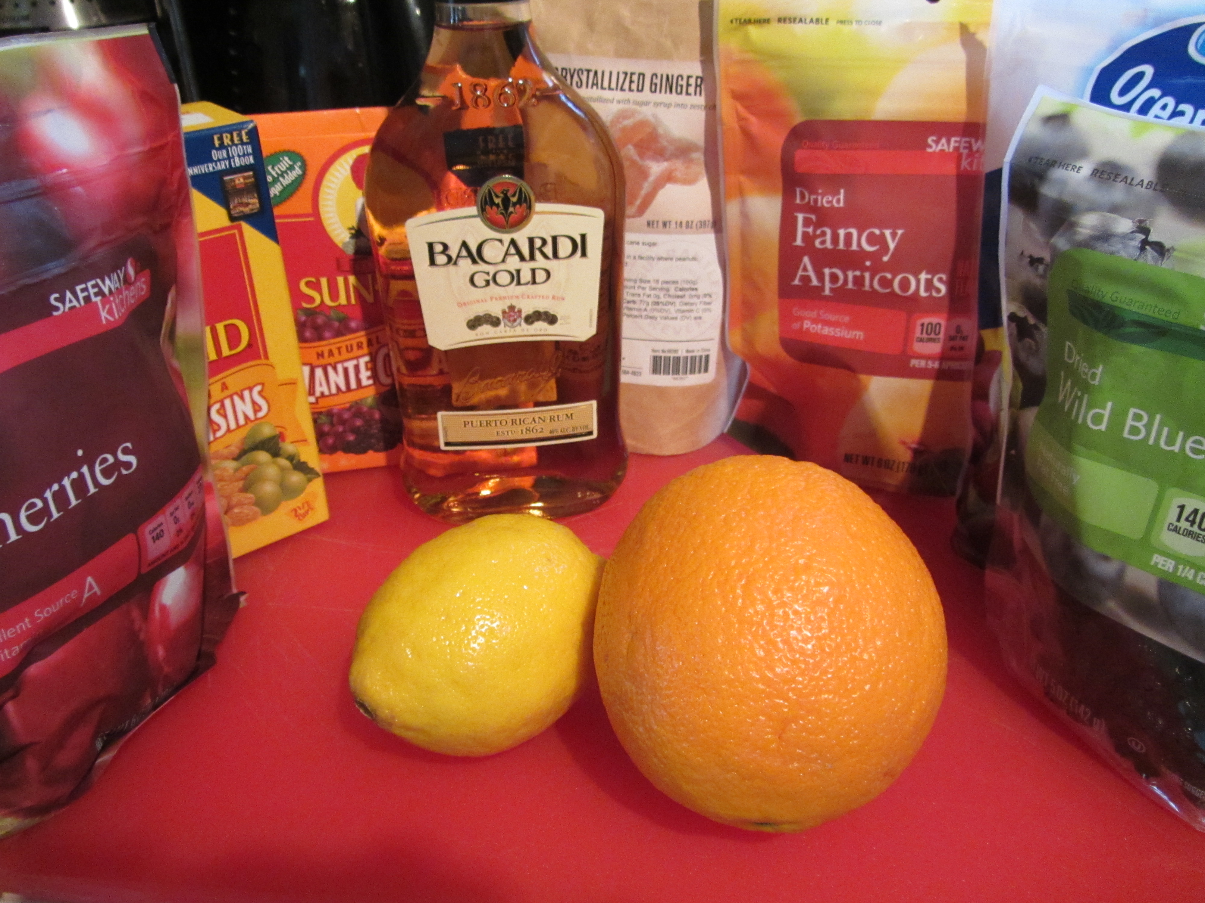 Alton’s fruitcake recipe begins with macerating in rum a plethora of dried fruit (golden raisins, currants, cranberries, blueberries, cherries, & apricots), along with lemon zest, orange zest, and candied ginger.