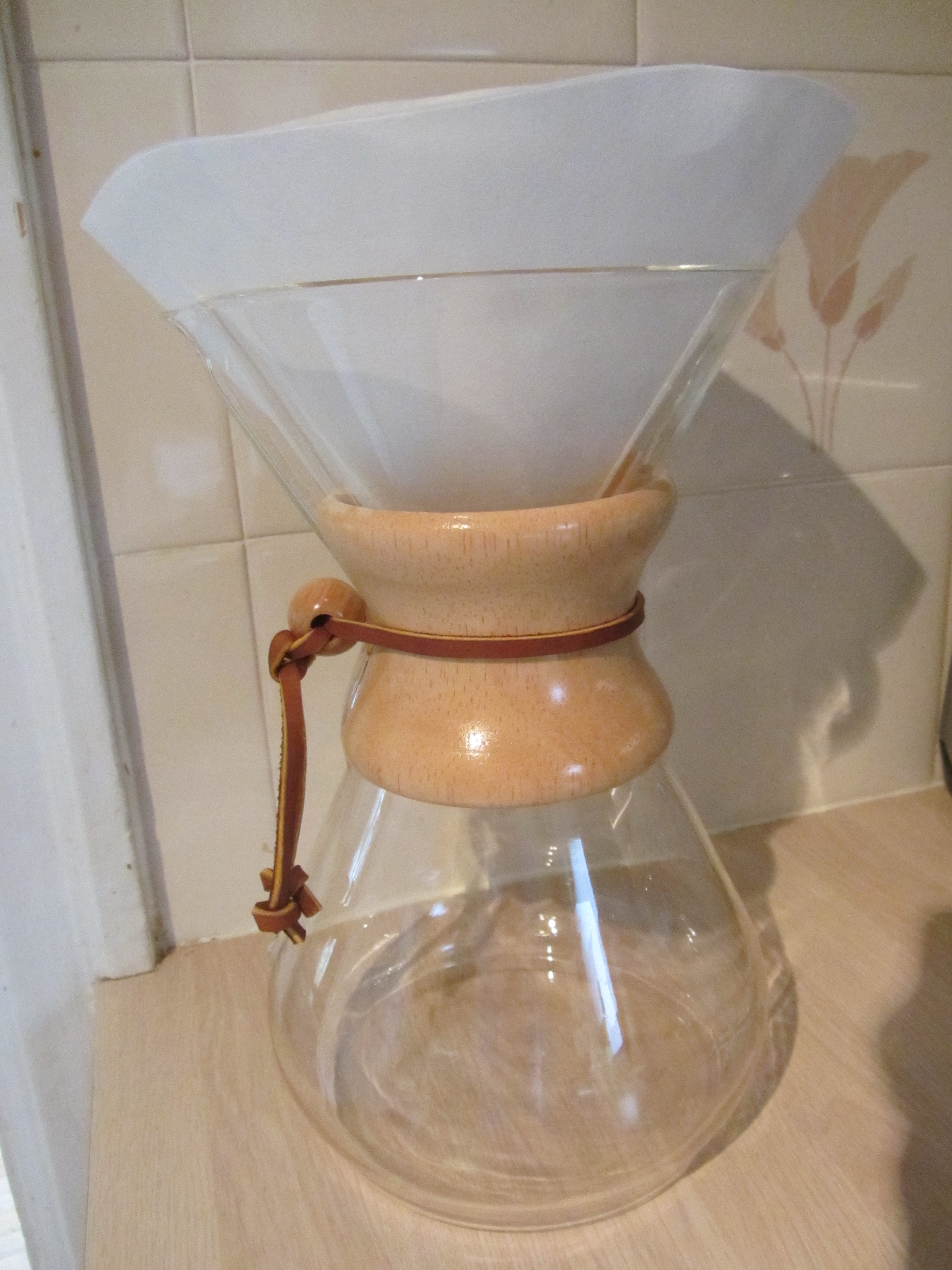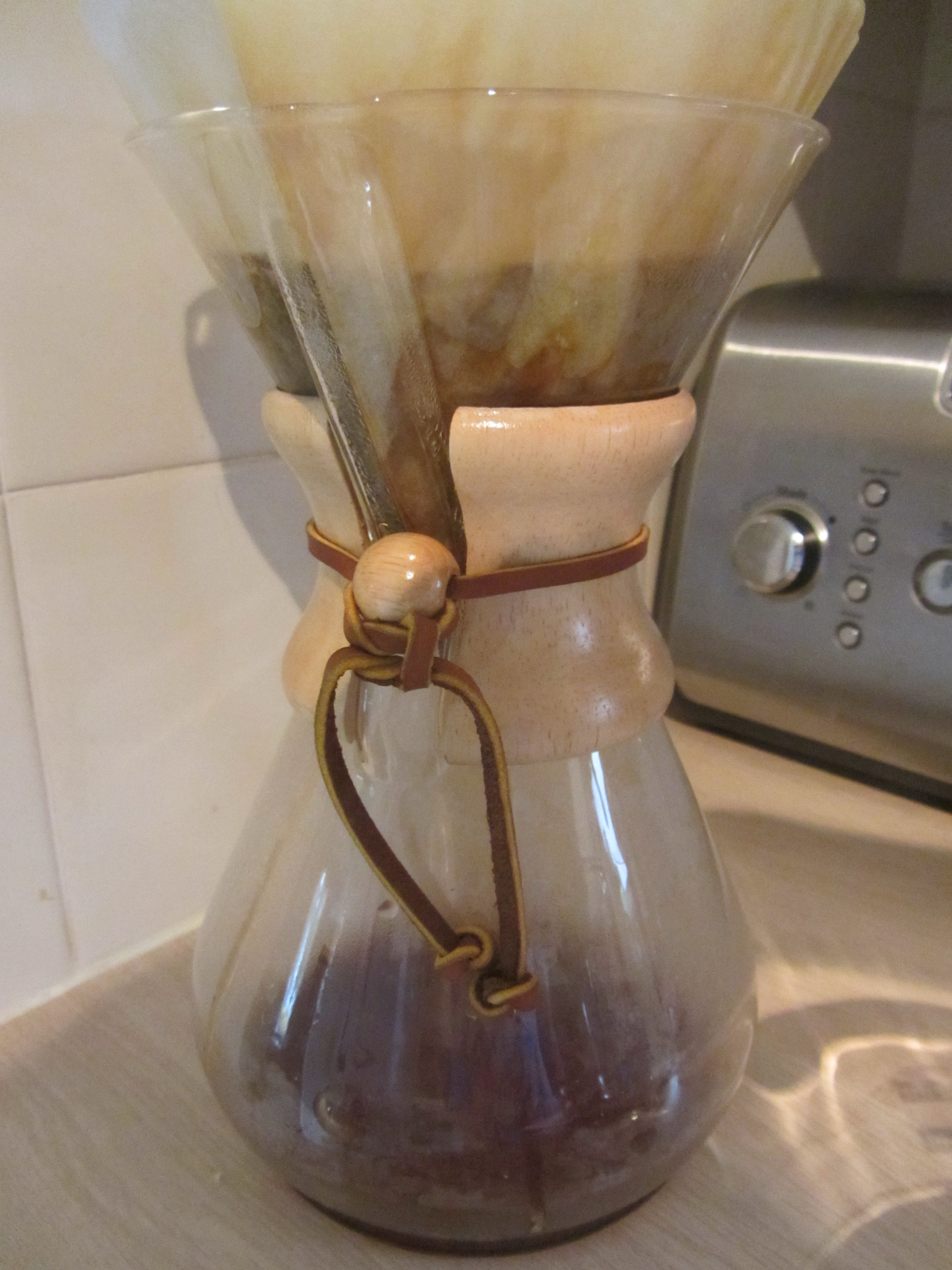 Ideally, you want to use a gold mesh coffee filter for extraction, which is placed over a thermal carafe. This maintains the water temperature. Since we don’t have a thermal carafe, I used my husband’s Chemex coffee maker and a paper filter.