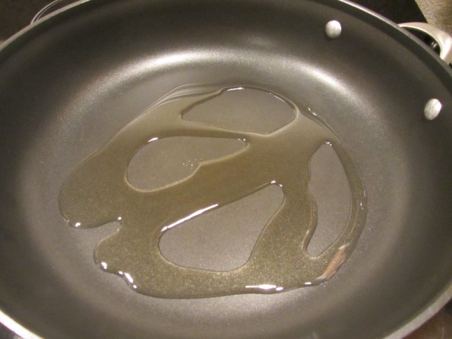 Olive oil heating in pan.