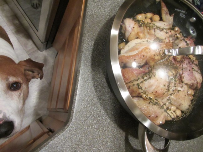 Chicken after 1 1/2 hours in the oven. Oh, and a begging, pleading hound.
