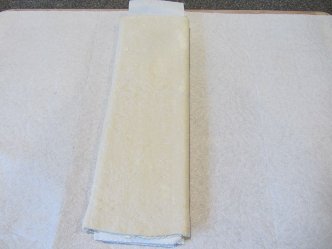 Puff pastry sheet, thawing. Soon to be wrapped in a paper towel to avoid condensation.