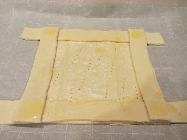 Second set of walls placed on top, and corners again dabbed with egg wash.