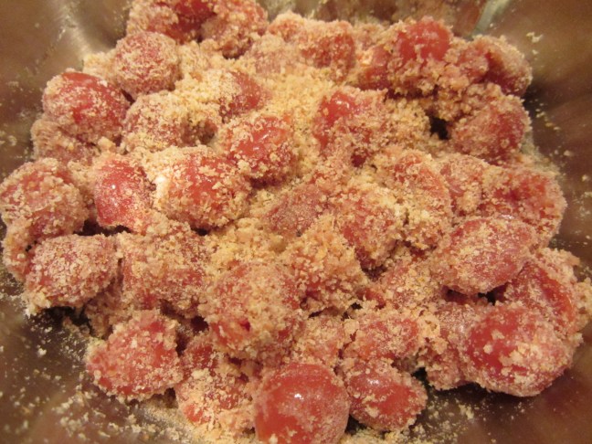 Pie cherries and crumbs, sitting for 10 minutes to absorb excess moisture.