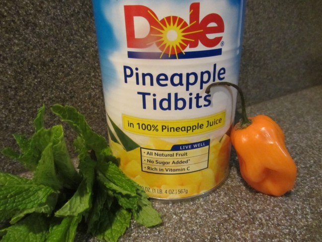 Ingredients for Alton’s pineapple sauce: 1 can of pineapple tidbits, fresh mint, and a habanero pepper.
