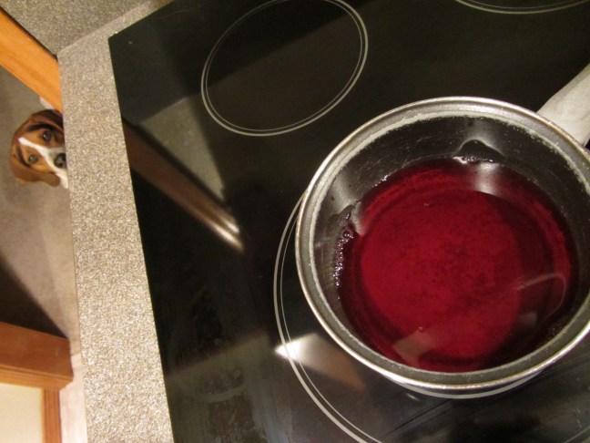 Additional cup of cranberry juice, being brought to a boil under careful supervision.