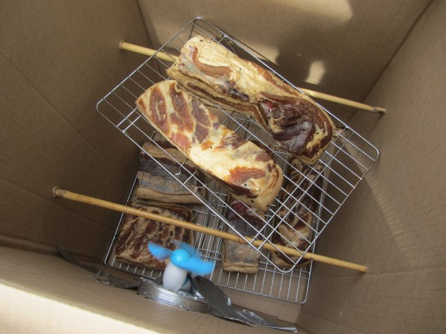 The large box of my smoker to hold bacon. Small fan to circulate smoke.