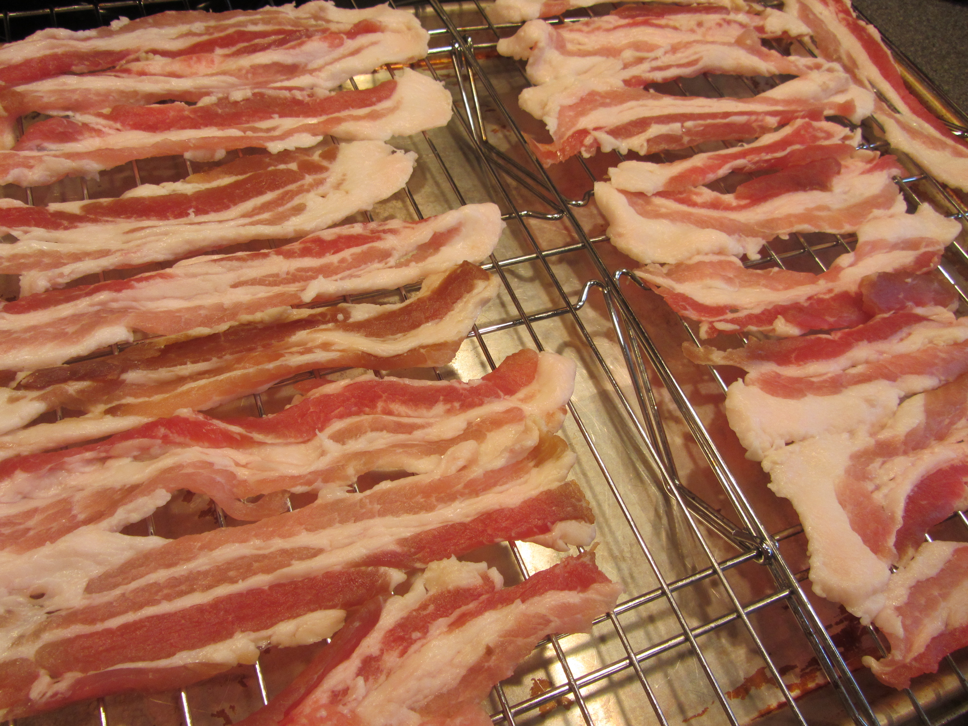 Cooking bacon the Alton way – on a rack in a cold oven set to 400 degrees.