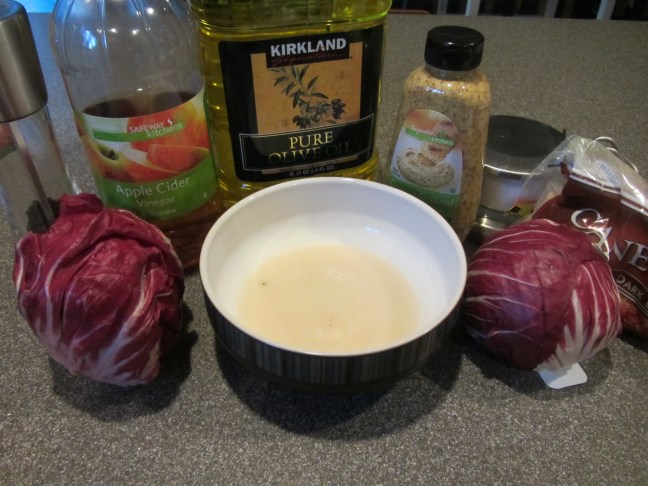 Ingredients for Alton’s grilled radicchio: radicchio lettuce, bacon drippings, Kosher salt, pepper, brown sugar, coarse mustard, cider vinegar, and olive oil.