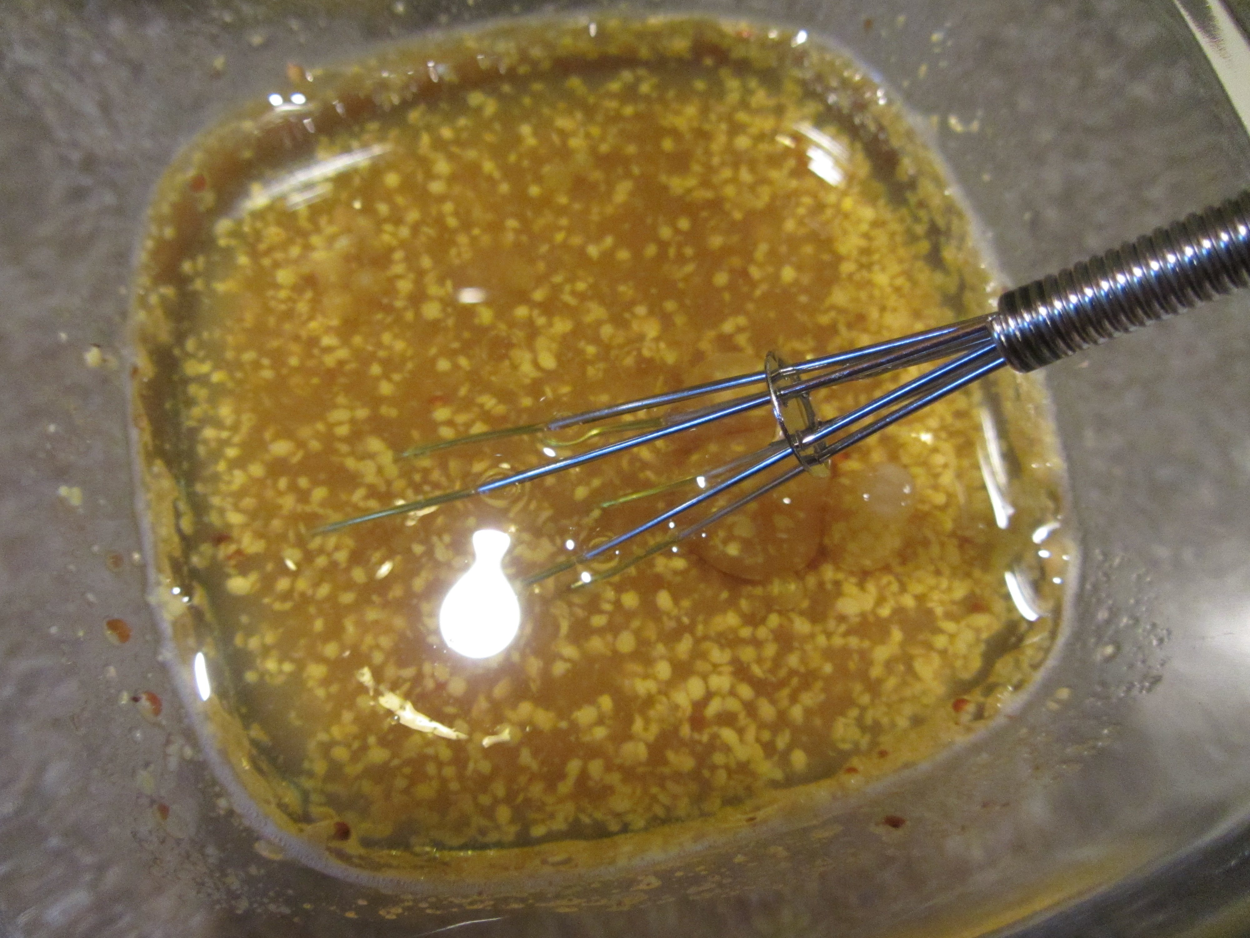 1 T brown sugar, 1 T coarse mustard, 1/4 C cider vinegar, and 1/4 C olive oil.