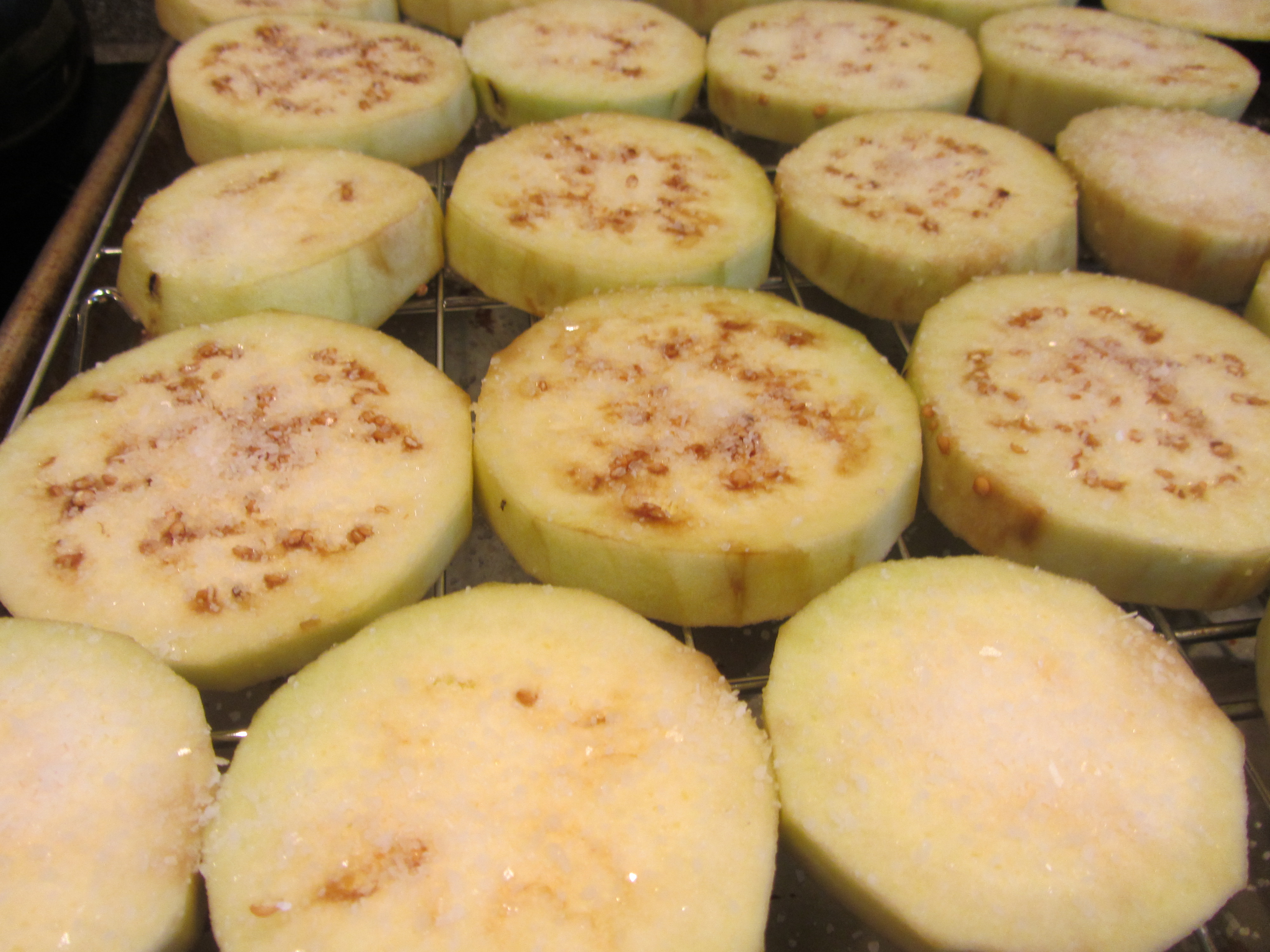 Eggplant peeled, sliced, and salted.