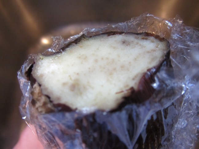 Cut the stem end off of your eggplants and squeeze out their flesh. Didn’t work for me.