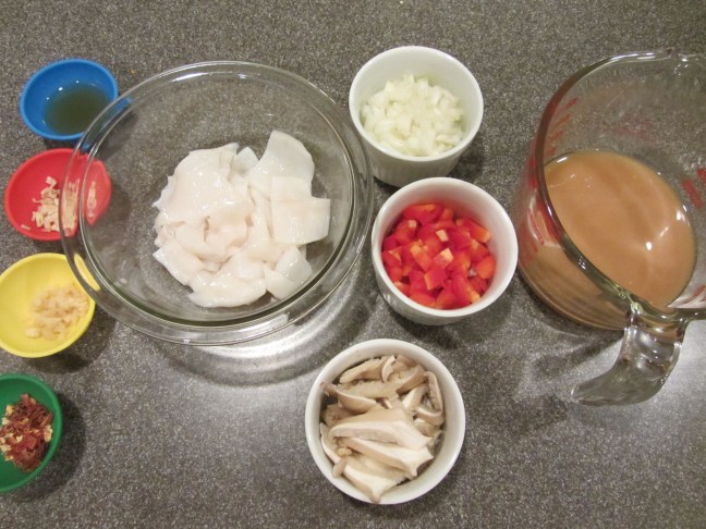 Ingredients for Alton’s squid recipe: sesame oil, garlic, ginger, dried chilies, squid, onion, red bell pepper, and oyster mushrooms. Also, a combination of balsamic vinegar, cornstarch, and miso broth.