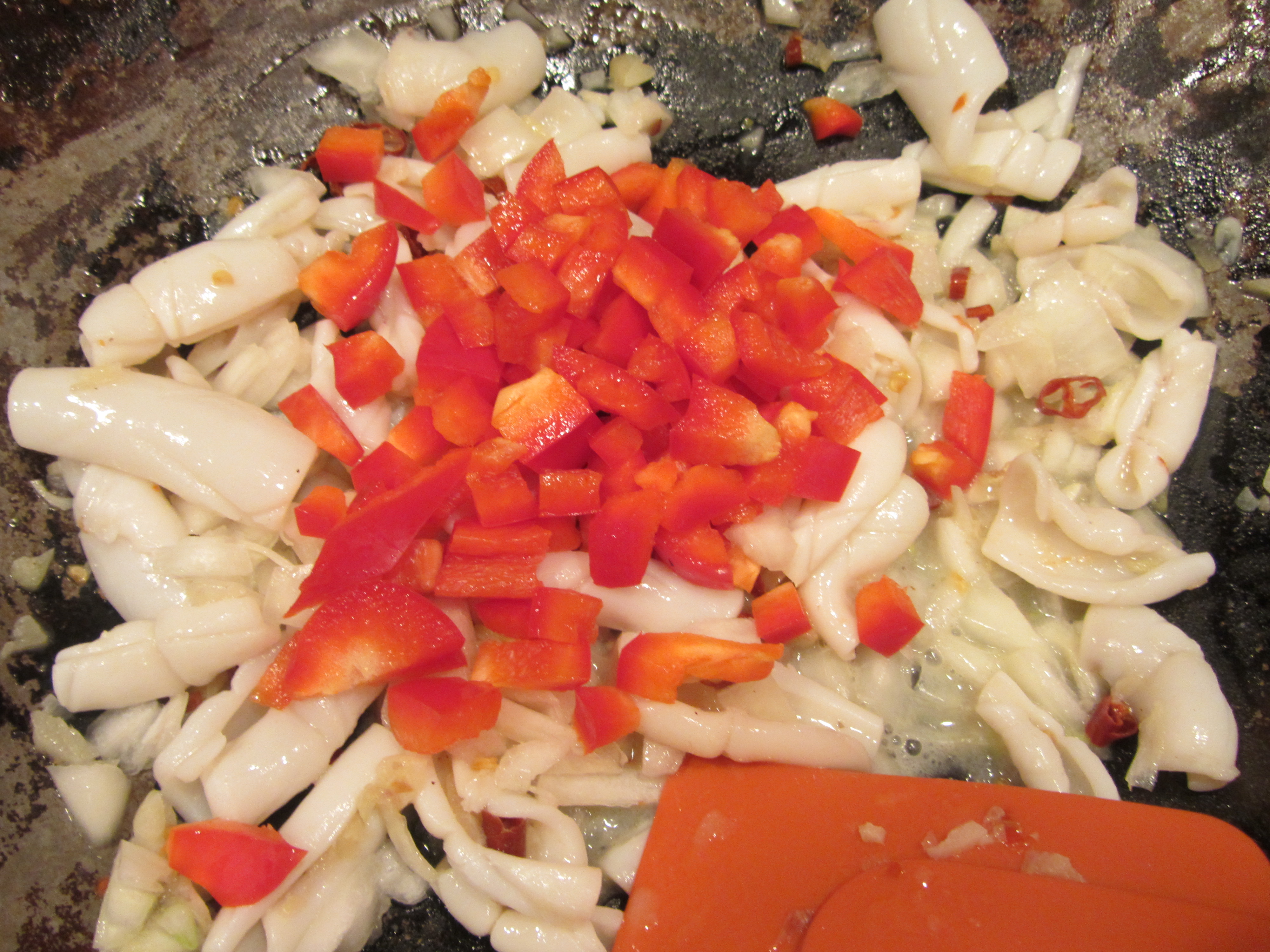 Red bell pepper in the wok.