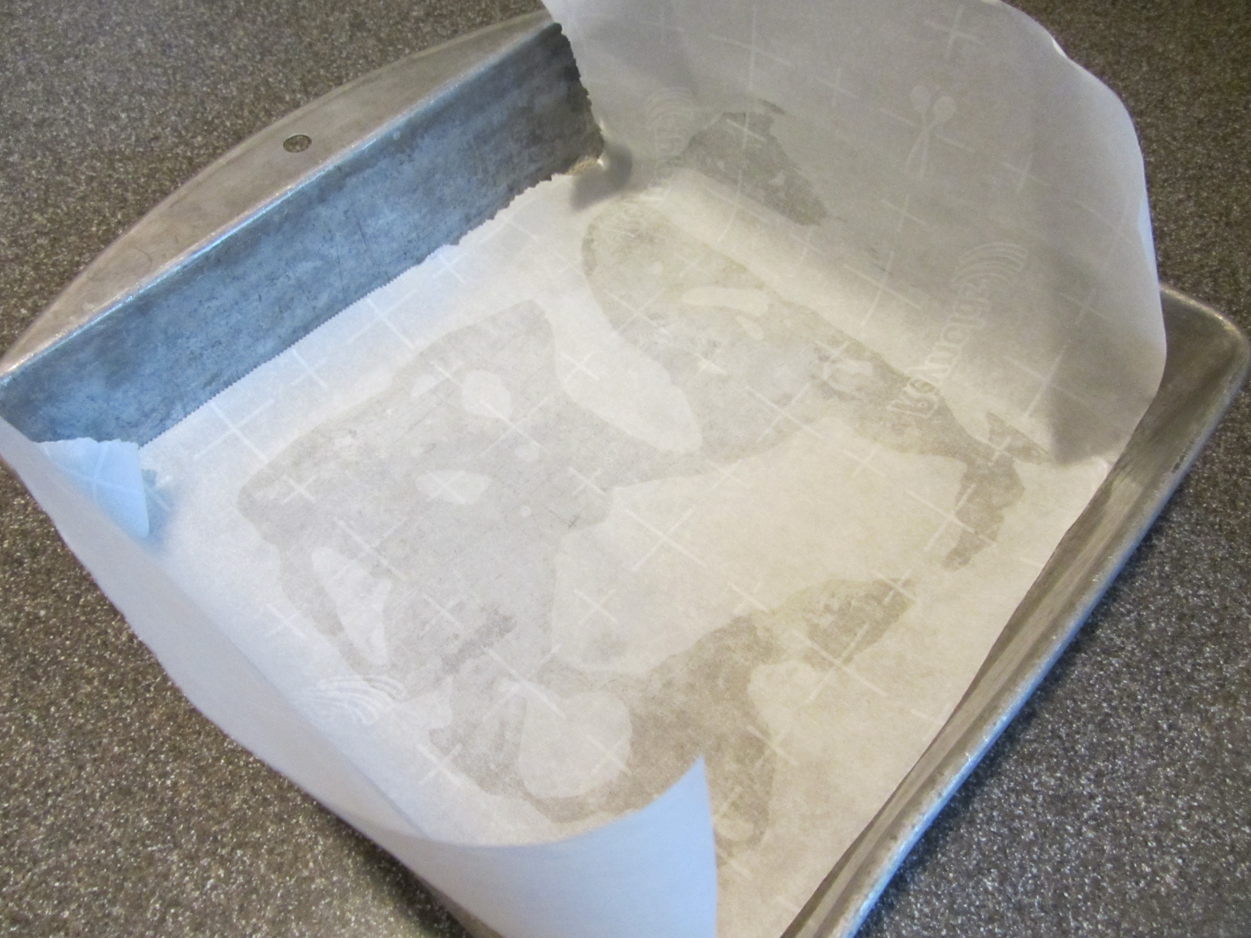 Pan sprayed with nonstick spray and lined with parchment paper to overhang on two sides.