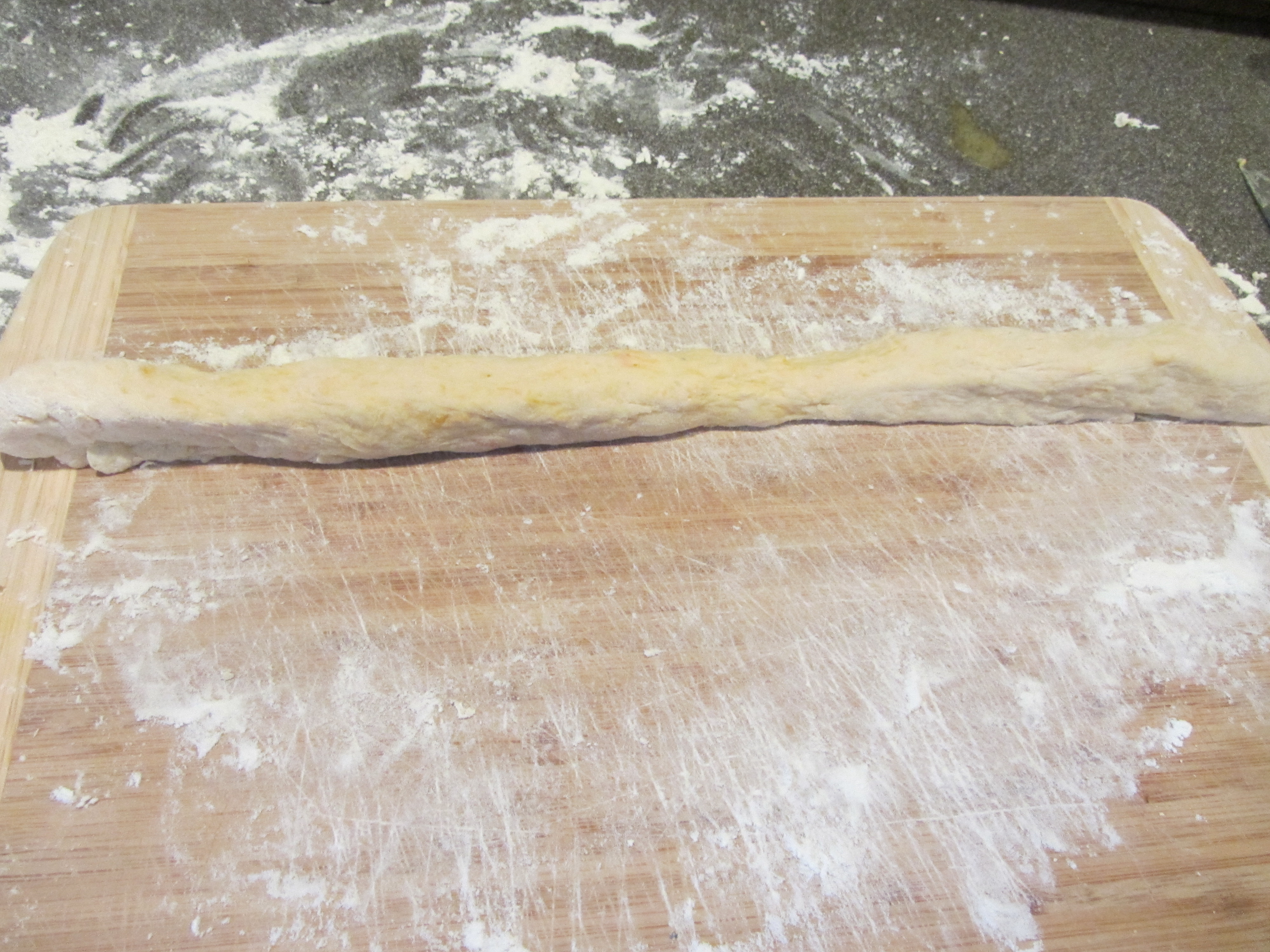 One dough piece, rolled into a snake.