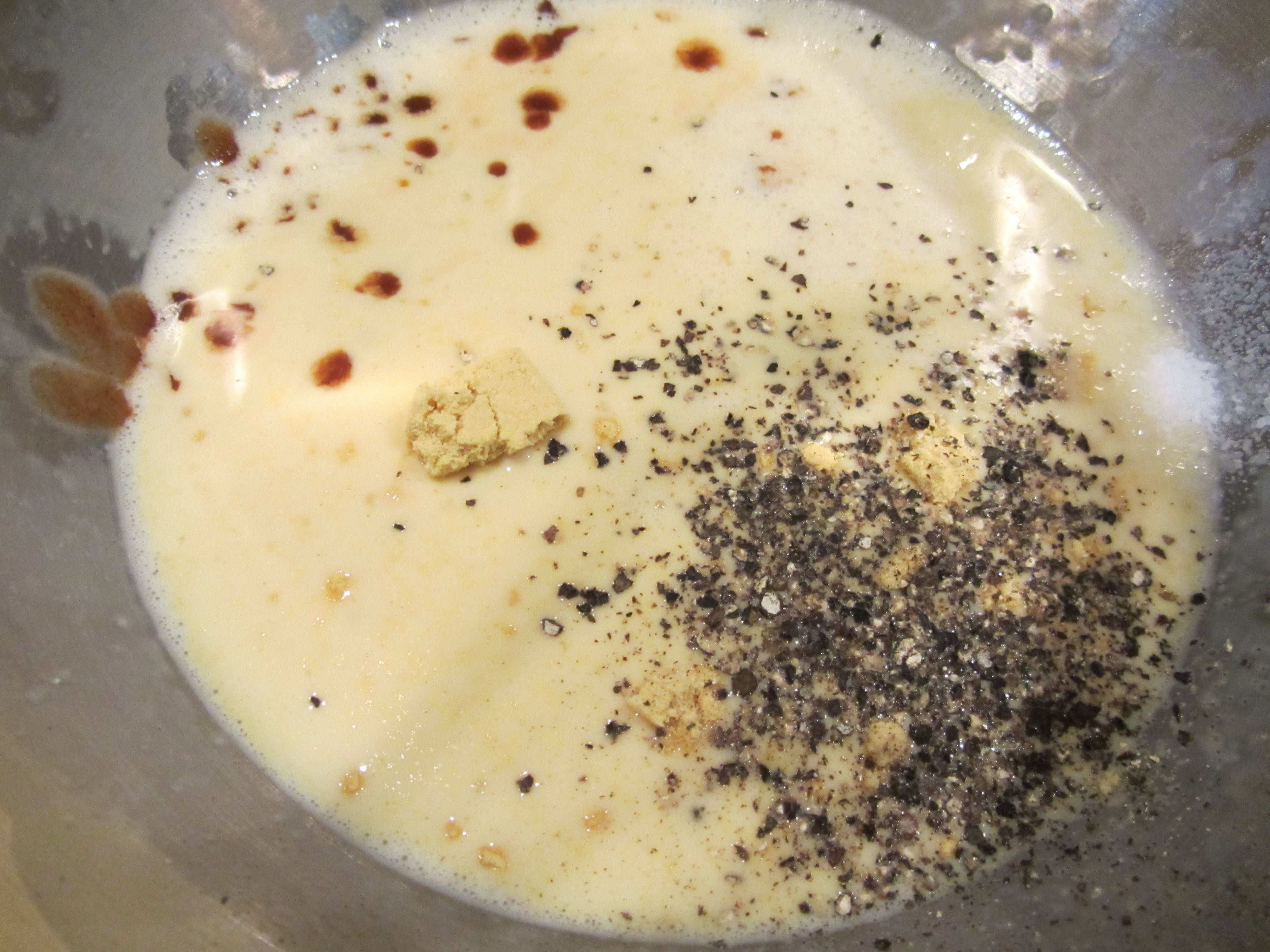 Hot sauce, powdered mustard, Kosher salt, and pepper added to sauce.