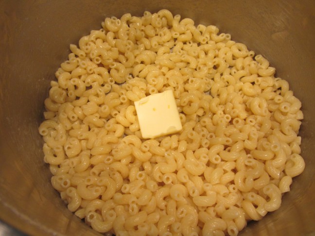 Butter added to hot elbow macaroni.