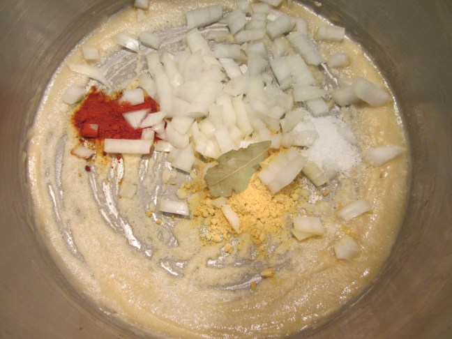 Powdered mustard, paprika, chopped onion, a bay leaf, and Kosher salt added to roux.