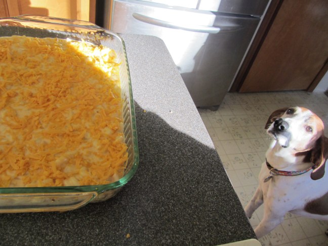 Mac and cheese in casserole dish, with remaining cheese sprinkled over the top.