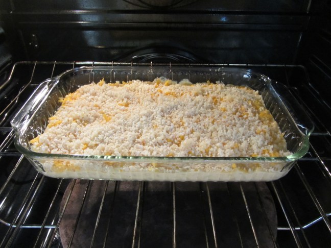 Buttered panko sprinkled over mac and cheese, and into the oven for 30 minutes.
