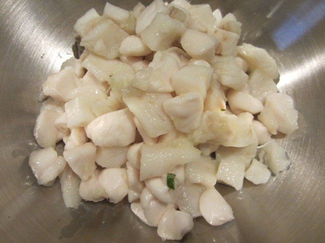 Fish and scallops, after marinating and being drained.