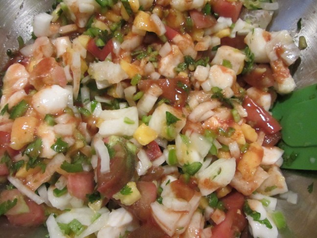 White wine Worcestershire, hot sauce, and tomato juice, added to ceviche.