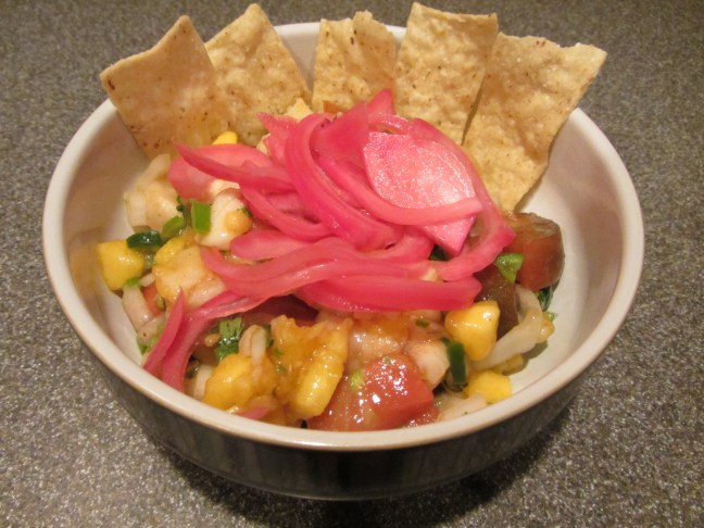 A bowl of Alton’s ceviche with pickled onions and tortilla chips.