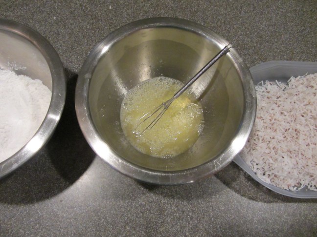 Three containers for coating shrimp: cornstarch mixture, egg whites, and coconut.