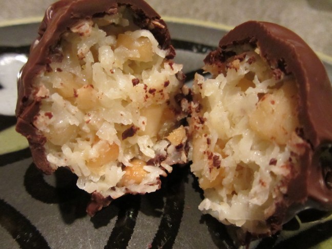 The inside of a chocolate coconut ball.