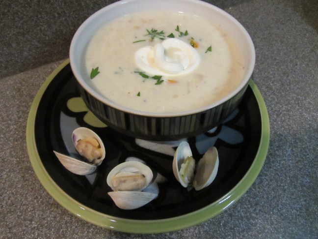 Clam chowder with parsley, pepper, tomatoes, sour cream, and steamed clams.