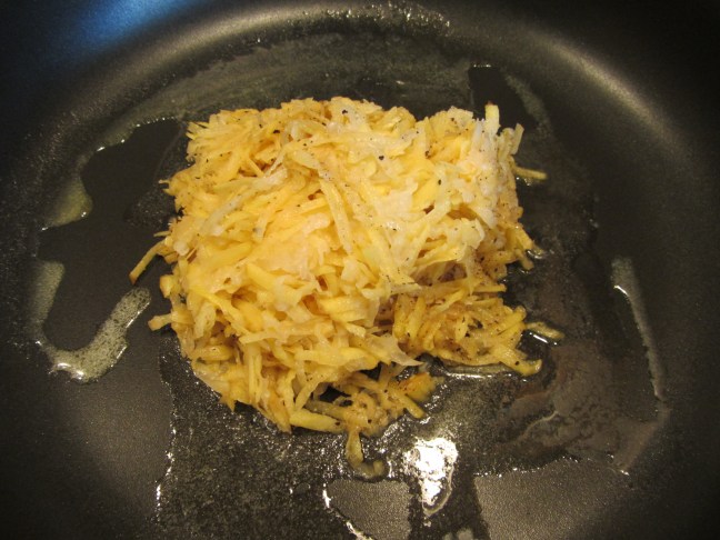 Seasoned potato/onion mixture into pan.