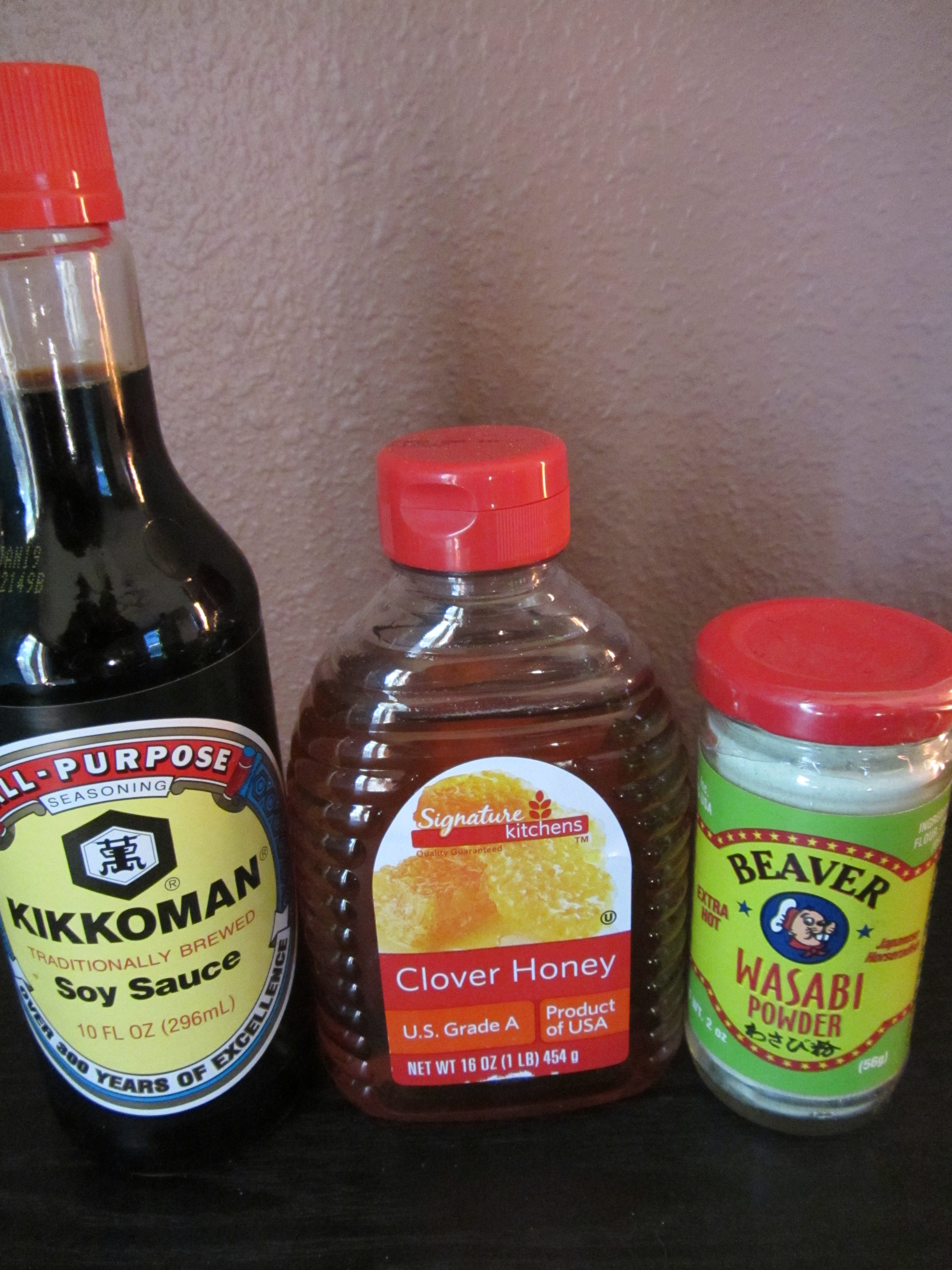 Soy sauce, honey, and wasabi powder for the marinade/dipping sauce.