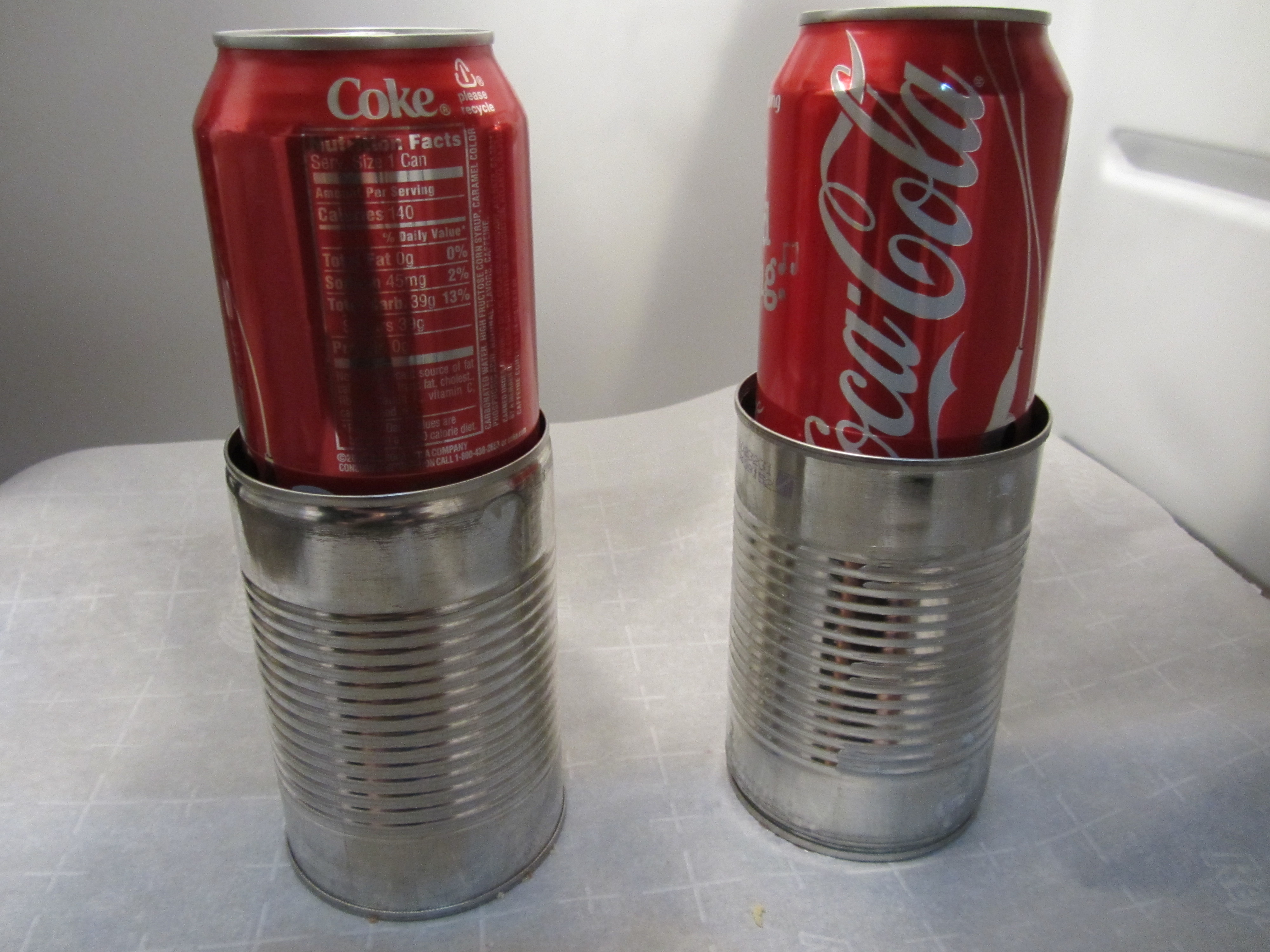 Full sodas placed on top of lids. Cans placed in refrigerator for 8 hours.
