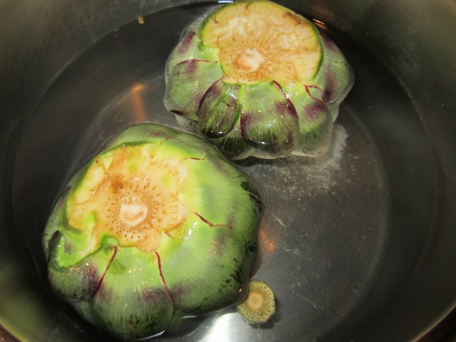 Artichokes and peeled stems in a wide pot with 2 t Kosher salt, and covered with cold water.