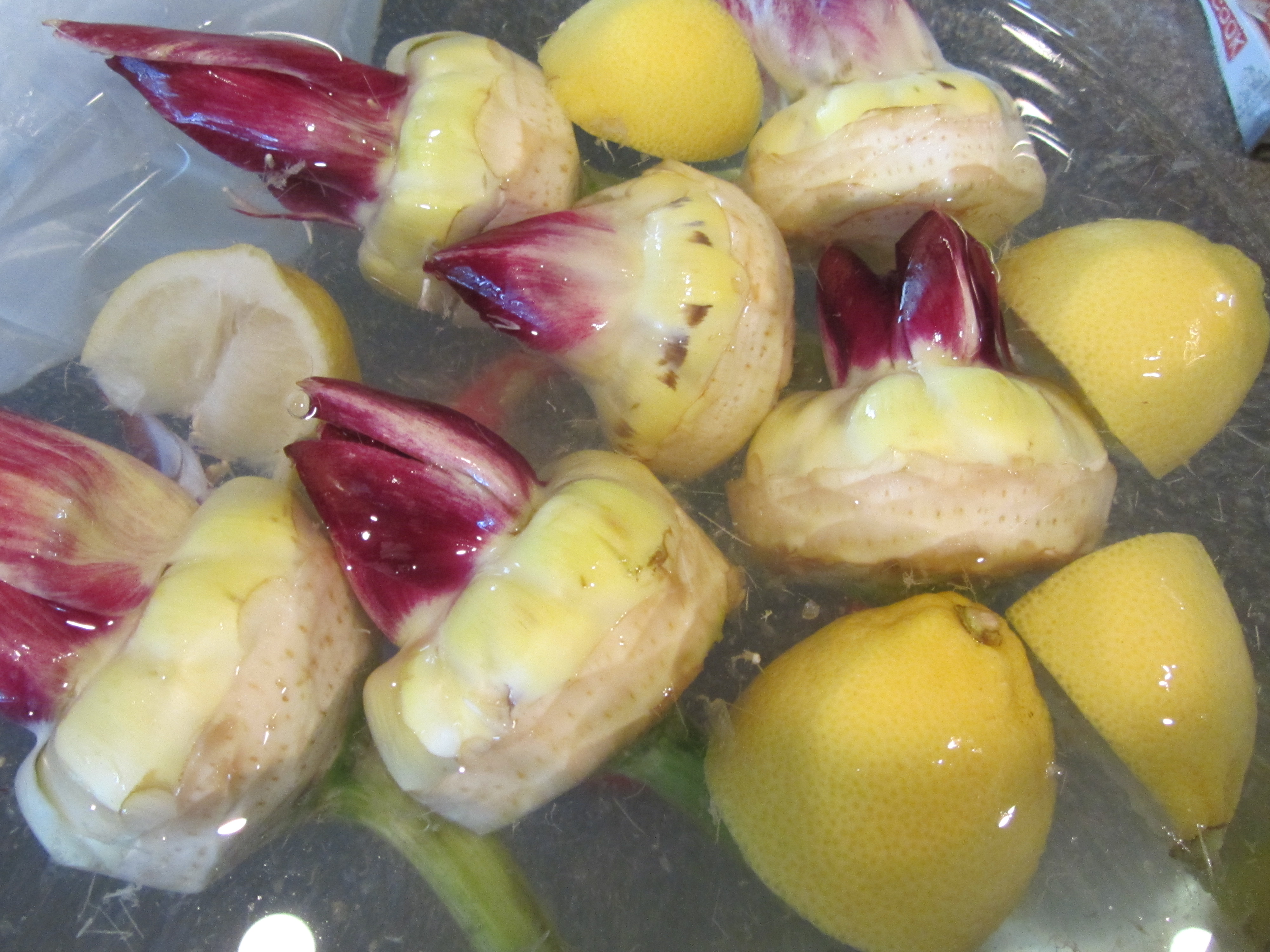 Cleaned chokes, placed in lemon water.
