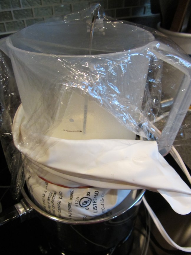 Yogurt added to milk and wrapped with heating pad to ferment for 6 hours.