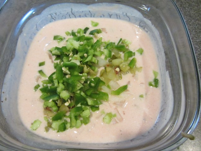 Diced onion, pickle relish, chopped green olives, and jalapeno added to dressing.