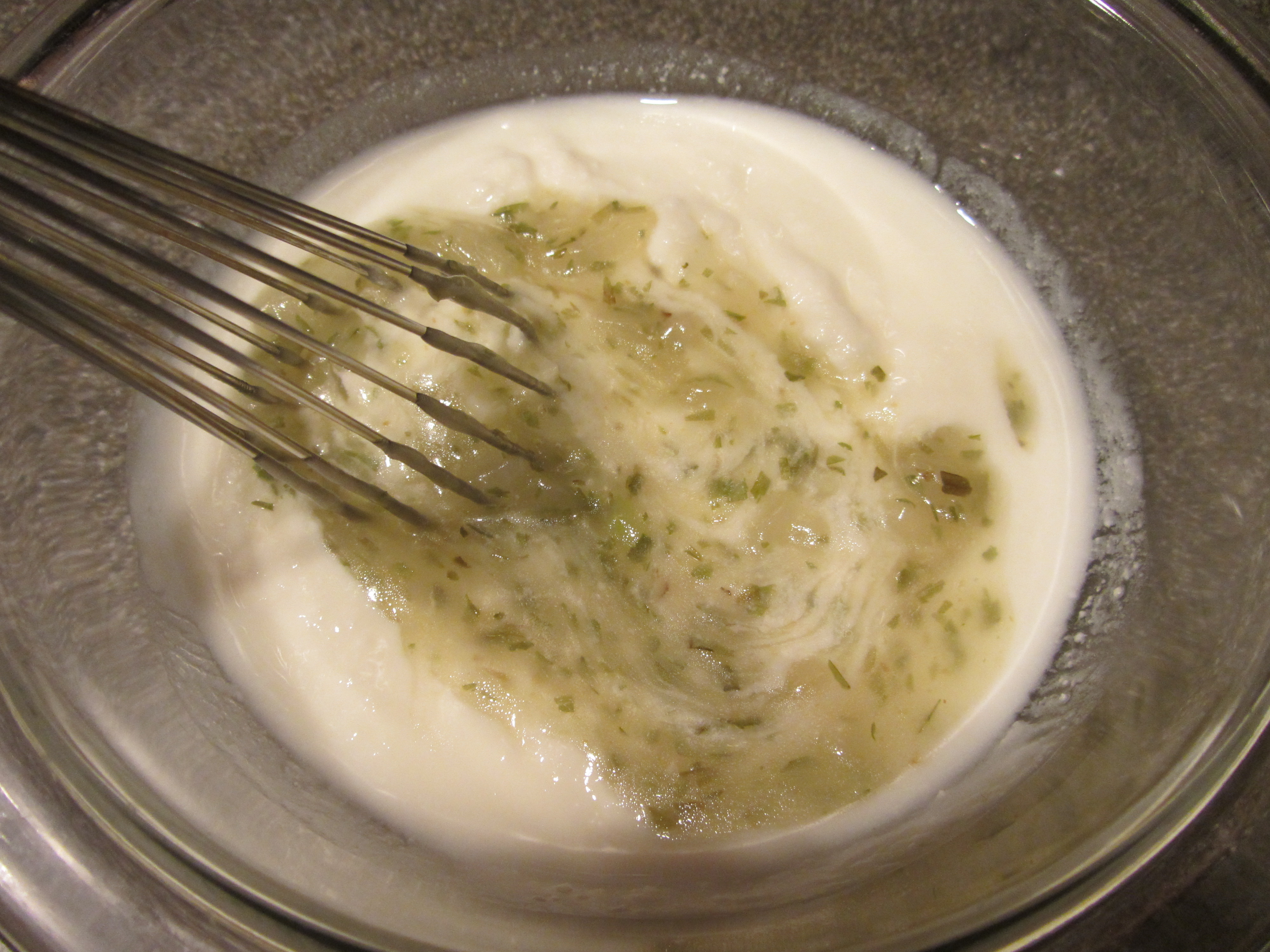 Tempering yogurt by whisking in some of the warm tarragon mixture.