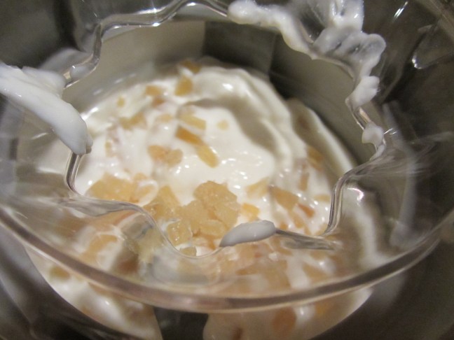 Chopped crystallized ginger added to ice cream maker in final minutes of churning.