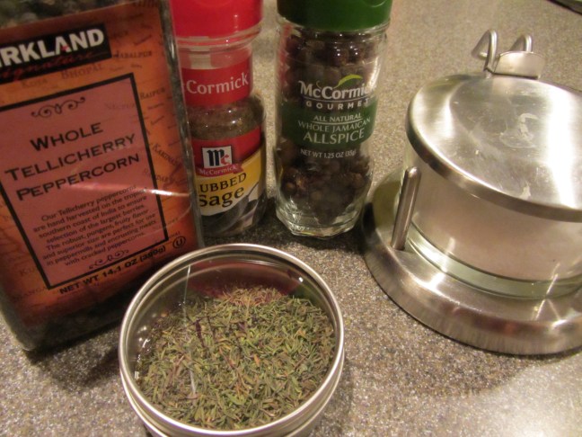 Ingredients for turkey dry rub: Kosher salt, dry thyme, rubbed sage, black peppercorns, and allspice berries.