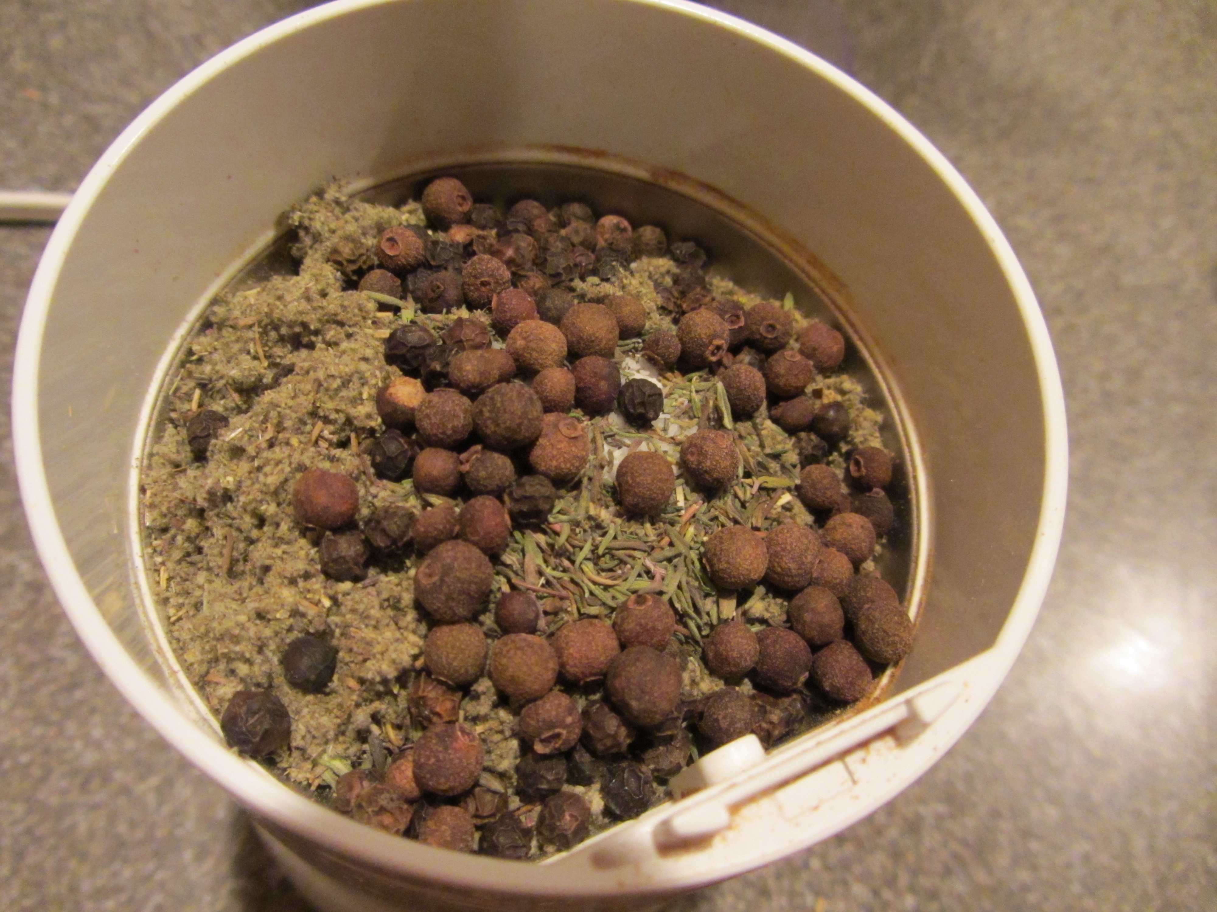 Kosher salt, dry thyme, rubbed sage, black peppercorns, and allspice berries in spice grinder.