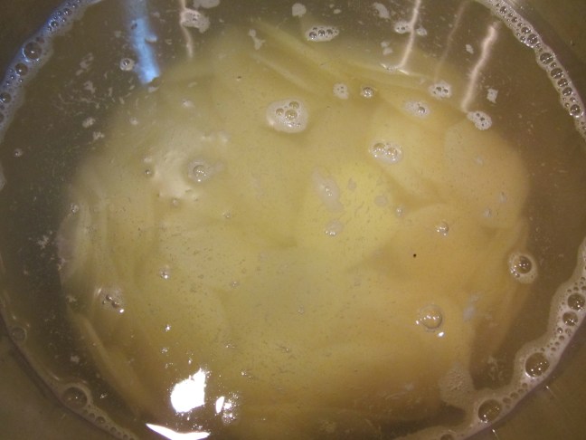 Potato slices in a large pot, covered by cold water.