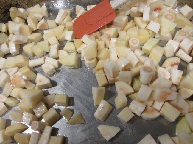 Rutabagas and parsnips placed in roasting pan with vegetable oil.