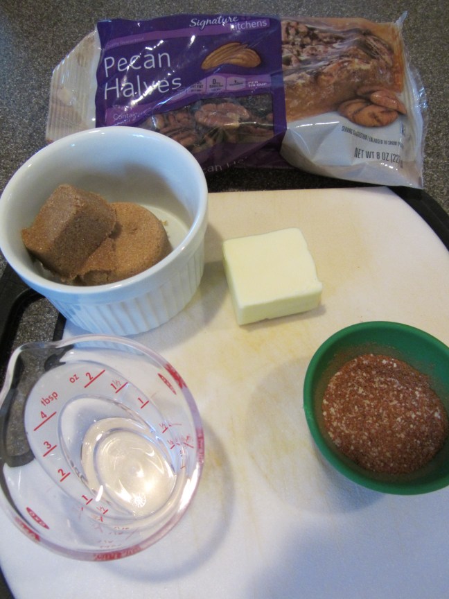 Ingredients for spiced pecans: pecan halves, light and dark brown sugar, butter, water, and spice blend.