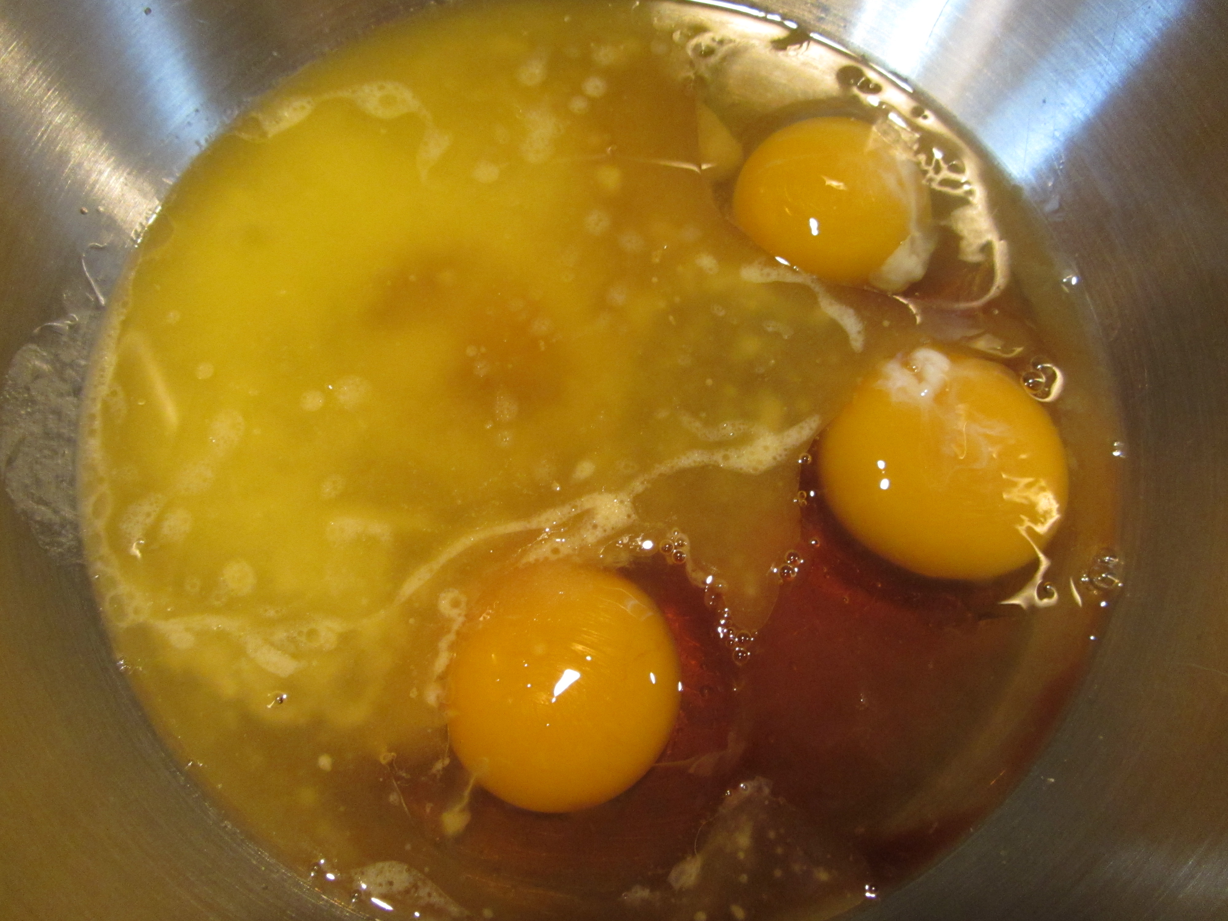 Eggs, sugar, Kosher salt, vanilla, bourbon, golden syrup, and melted butter.