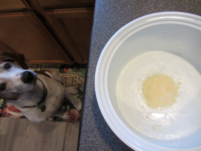 Grated Parmesan added to buttered souffle dish.