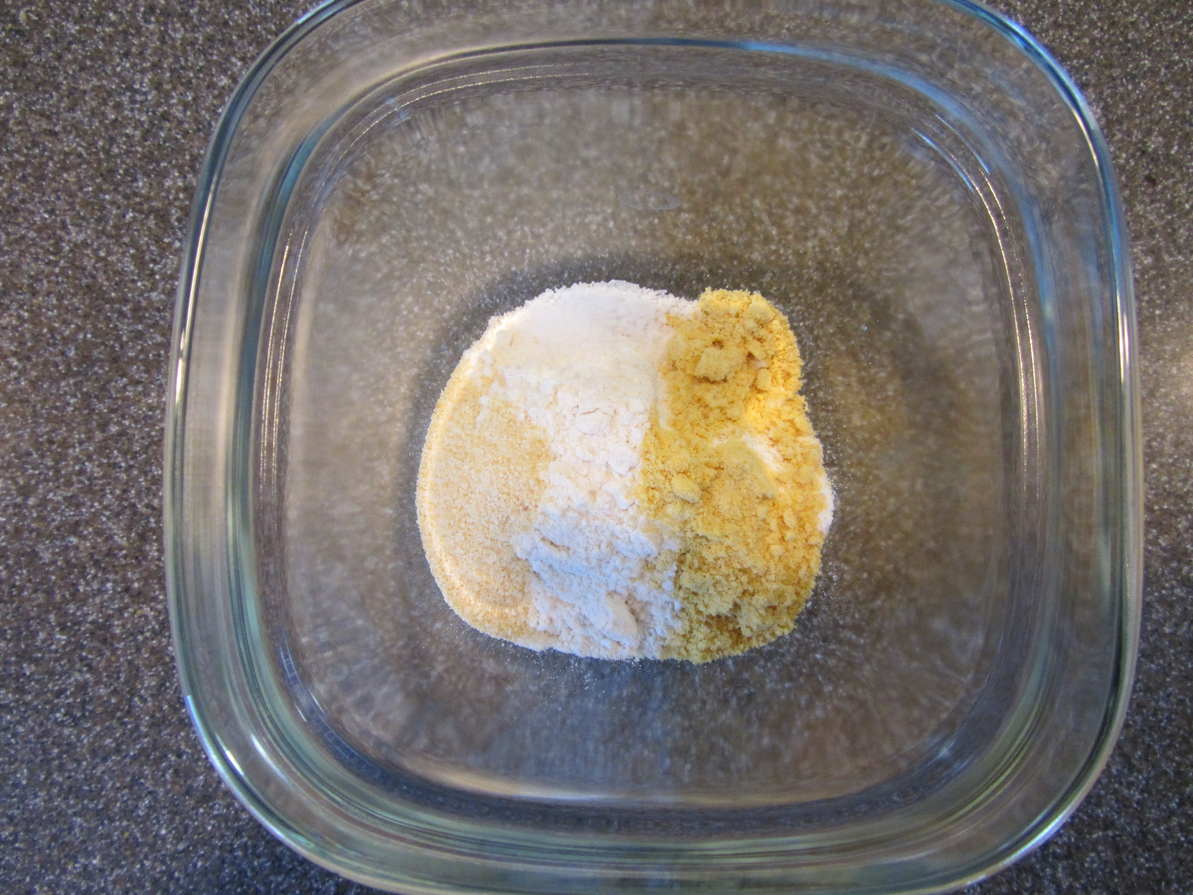 Kosher salt, dry mustard, and garlic powder added to flour.